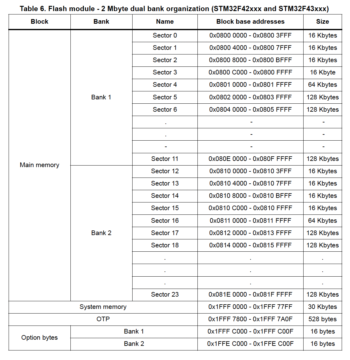 The STM32F429 has 2MB of internal flash memory organized into sectors of varying sizes. Different sectors have different sizes, and this matters when planning a memory layout.
